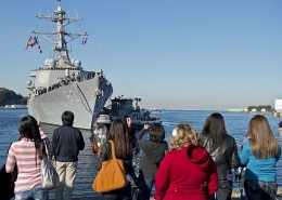YOKOSUKA, Japan (Nov. 16, 2012) The Arleigh Burke-class guided-missile destroyer USS Stethem (DDG 63) returns to Fleet Activities Yokosuka after an eight month deployment to the U.S. 7th and 5th Fleet areas of responsibility. (U.S. Navy photo by Mass Communication Specialist 3rd Class Gregory A. Harden II/Released) 121116-N-HI414-005 |